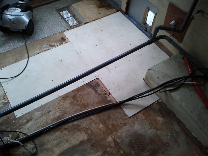 Untere Holzschicht ist erstmal mit Wetterschutzlasur behandelt und wird mit dem zugeschnittenen Rahmen aus 20x30 Latten verschraubt und verklebt. Im Gegensatz zur Reparatur im Eingangsbereich, ist das neue Stück aus 2 Teilen etwas größer und fummeliger, funktioniert aber genau so. Das Ergebnis passt dann +/- 1mm in den Ausschnitt und wird dort mit V2A Schrauben 4,5x45 verschraubt, so dass die Unterseite des Bodens bündig mit dem Altboden ist. Anschliessend kommen im Abstand von 13-15cm noch weitere Latten in den Boden, sowie das 20er Styrodur dazwischen. Alles mit Sprühkleber verklebt und die Latten zusätzlich verschraubt. Abschliessend dann der Deckel drauf und ebenfalls verklebt und verschraubt.