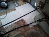 Die Nähte der Unterseite werden erstmal mit Sikaflex abgedichtet. Anschliessend erfolgt noch die Versiegelung mit Unterbodenschutz (bei der Gelegenheit kommt natürlich noch einiges an Unterboden dran...). Die Oberseite stabilisiere und versiegele ich zusätzlich mit Kunstharz und Glasfasergewebe - das ist auch ein passender Höhenausgleich für den hier fehlenden PVC-Boden und zugleich natürlich eine weitere Stabilisierung. Diese stabilisierende Schicht ziehe ich dann auch gleich bis in das komplette Bad und bis vor den Kleiderschrank, da hier die oberste Holzschicht irgendwie weich erscheint, auch wenn nichts morsch ist und auch von der Fahrzeugunterseite her gut aussieht.