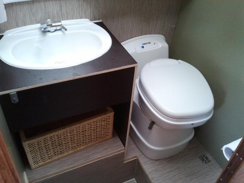 Duschwanne und die ganze Installation fliegt auch raus - die schon vom Vorbesitzer (schlecht) eingebaute Thetford Cassettentoilette bekommt einen ordentlichen und jetzt passenden Sockel aus Tischlerplatte mit etwas vorgesetztem Stauraum (damit man nicht mit den Füßen in der Luft hängt, wenn man auf der Schüssel sitzt...).