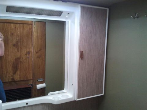 Also Badwände mit den Möbeln ausgebaut und die leider stark mitgenommene gemusterte Innenseite mit einem guten Lack gestrichen - ganz dezent in einem grau/grün, damit es einigermaßen zu der Siebdruckplatte passt, aus der ich den Waschtisch baue. Die Seitenwände waren natürlich schon mit den Möbeln wieder reingekommen und sind auch an mehreren Stellen mit den Hängeschränken verschraubt.