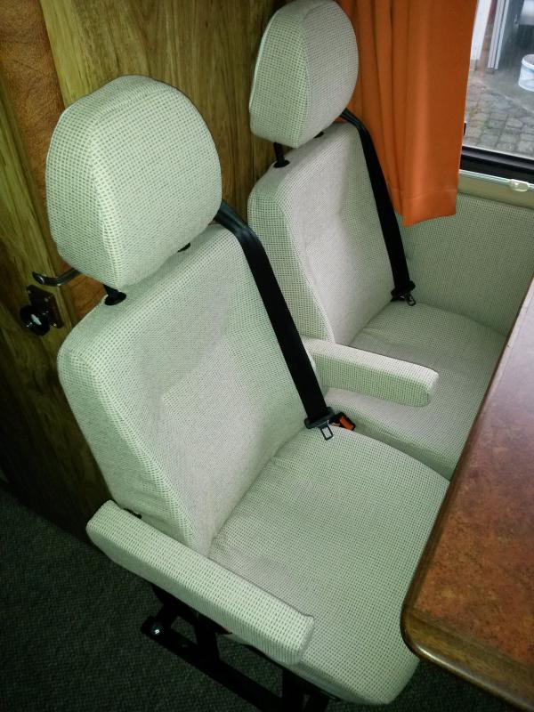 Schritt 4: Alles einbauen... Auf diverse Unpässlichkeiten vorbereitet, war ich doch überrascht: Alles passte exakt wie geplant. Gestelle am Hymer festgeschraubt, Sitze drauf und die Gurte auch wieder an den Original-Aufnahmepunkten fixiert.