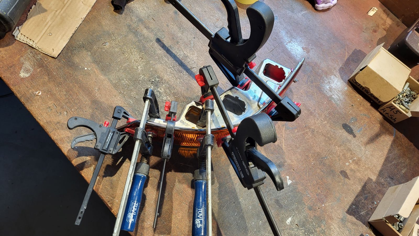 Also wieder Kleber raus, und die Dichtungen unter Spannung am Leuchtenkörper festgeklebt. Auch hier wieder: Viel Geduld, viele Klammern und unerwarteter Zeitaufwand für eine so triviale Sache, obwohl man mit Neuteilen arbeitet...